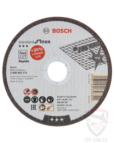 Круг відрізний по нержавіючій сталі Bosch Standart for Inox 125x22.2x1мм (2608603171) купити по вигідній ціні 42 грн. в магазині інструментів та обладнання ТДП "Трейд Плюс" з доставкою по Києву та всій Україні. Зателефонуйте нашому менеджеру і він запропнує товари із каталогу: чи аналог товару від виробника Bosch із широкого асортименту продукції. Інтернет магазин ТДП доставить замовлення в Харків, Вінницю, Луцьк. Найкраща пропозиція купити Круг відрізний по нержавіючій сталі Bosch Standart for Inox 125x22.2x1мм (2608603171) в інтернет-магазині ТДП "Трейд Плюс" просто зателефонувавши нам за номером 0(800)303-900
