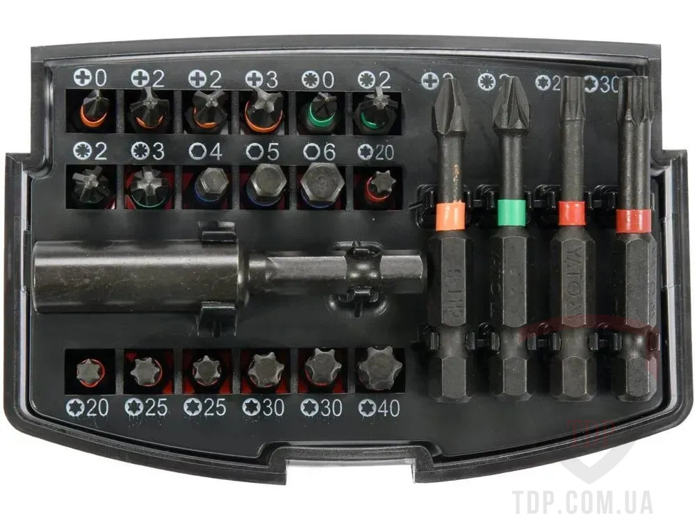 Набір біт ударних YATO з тримачем 23 шт (YT-04621) призначений для роботи з різними типами кріплень у поєднанні з ручними або ударними інструментами. Біти виготовлені зі сталі S2, що забезпечує підвищену міцність, зносостійкість і стійкість до великих навантажень. У комплект входить широкий асортимент біт різних профілів, що робить набір універсальним для застосування в ремонті автомобілів, монтажних роботах та обслуговуванні техніки. Тримач дозволяє швидко змінювати насадки та забезпечує надійну фіксацію під час роботи. Усі елементи розміщені у компактному пластиковому кейсі, який зручний для транспортування та зберігання.